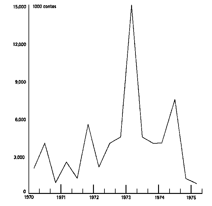 The financial situation in June 1975 shows a rise in imports of around 30 per cent in comparison to the same month last year, having reached 10,853,000 contos. In the same period exports rose to 4,627,000 contos showing a more modest rise of 17.5 percent. Thus the ratio of exports to imports worsened, exports forming only 42.6 percent.