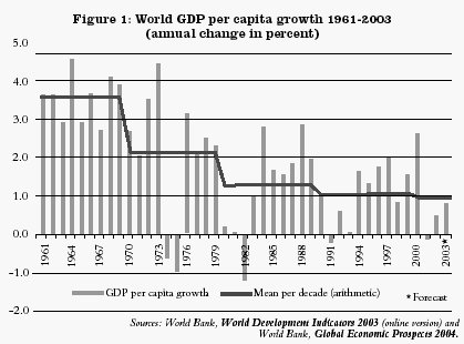 The first significant thing about the world economy is the way in which global economic growth, averaging out booms and recessions, has not only declined from the ‘golden age of capitalism’ in the 1950s and 1960s, but also from the levels known in the late 1970s and 1980s. This is shown in Figure 1. [2]