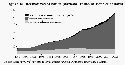 The last decade has seen worldwide a growing dependence on new forms of speculative borrowing and lending – derivatives (see Figure 15). These began as ways for corporations and banks to protect themselves against unexpected changes in currency exchange rates and have since developed into a form of gambling on all sorts of possible economic and financial shifts. The ‘hedge funds’ that engage in such gambling are now multibillion concerns.