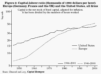 On the other side is the pressure that comes from US-based capitalism, with its three decades of a rising rate of exploitation of its workforce. So although some of the mainland European countries have succeeded in raising their output per hour worked until it is higher than that in the US, the longer hours worked in the US mean that its output per worker is still considerably higher than Europe’s.