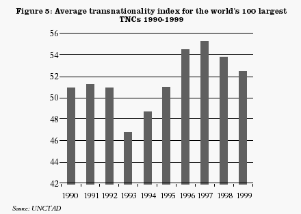 Figure 4 shows the average ‘transnationality’ of corporations, a composite measurement of the degree to which their markets, workforces and investments are outside their home country.
