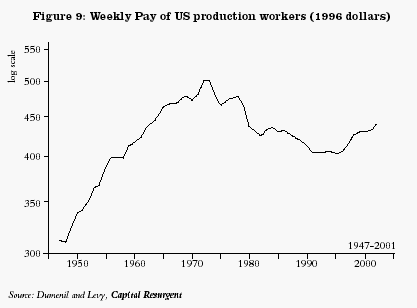 1. There has been a massive increase in the rate of exploitation of US workers. This is shown by the figures for real wages (Figure 9) and working hours (Figure 10). These are the figures give by the US Department of Labour. International Labour Organisation figures, calculated in a slightly different way, show a rise in the average working year in the US over the last quarter of a century from 1,883 hours in 1980 to 1,966 in 1997. [8]