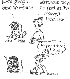 Another recruit of that time was Stuart Christie, who subsequently left IS to become an anarchist. In this new role, he went off to Spain with a suitcase full of anarchist literature and, according to Nicholas Walter, a plan to assassinate Franco. Almost immediately apprehended, he was sentenced to 30 years in gaol. In Glasgow, the IS comrades organised a protest at his sentence outside the Spanish consulate. Ian Mooney prevailed on his mother to run up a fair replica of a Spanish flag that could be symbolically burned outside the consulate. As the man who provided the flag, Ian insisted on being allowed to set it alight. To ensure a merry blaze he first soaked it with lighter fuel. Unfortunately he was extremely shortsighted and, while he successfully soaked and lit the flag, he also soaked and lit his own boots. Thus what might have been an easily forgotten protest has danced – along with Ian Mooney’s flaming boots – into the annals of Glasgow socialist folklore. (Stuart Christie was freed a few years later and was associated with the Angry Brigade, who were responsible for blowing some bits off the Post Office Tower. However, he was found not guilty of this offense.)