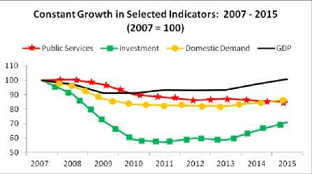 The usual pattern when an economy suffers a recession is that profits are the first hit while wage reduction usually lags. We can see this pattern above. Profits among non-financial companies fell by nearly 30 percent up to 2009 but since then they have nearly recovered to the prerecession level. Wage reductions lagged but have been on a downward trend and are still 15 percent below their pre-recession levels. Investment collapsed and despite increasing since 2010, investment is still over 40 percent below pre-recession levels.