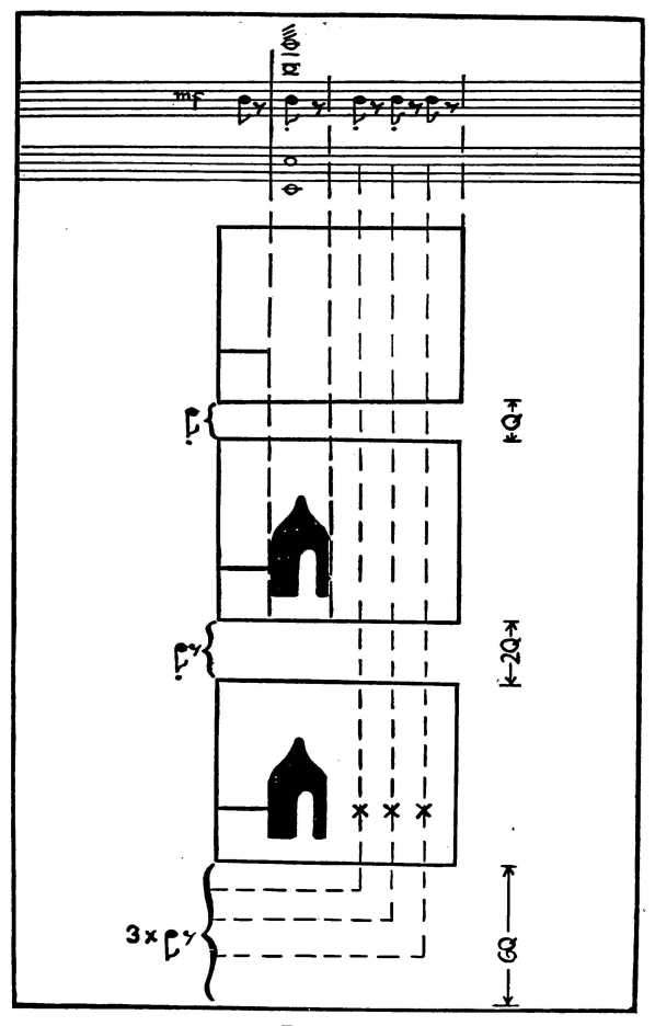 Neste estádio da discussão, deixaremos de lado os detalhes de como as repetições e variações são entrelaçadas harmoniosamente. A este respeito o diagrama é muito claro, tanto através de seu espaçamento, quanto de suas figuras.