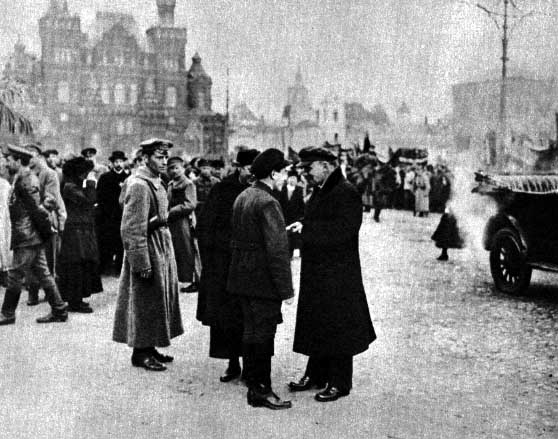 Conversando com V. M. Zagorsky, Secretário do Comitê de Moscou do P.C.R.(B), na Praça Vermelha em Maio, na comemoração do dia internacional do Trabalhador.