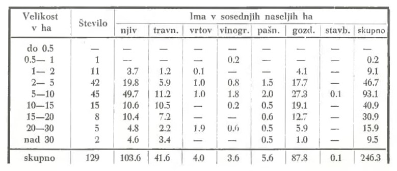 19 V vsej Sloveniji pripada celotna površina posameznim skupinam zemljiških gospodarstev izraženo v odstotkih: do 0.5 ha 0.4, 0.5–1 ha 0.8, 1–2 ha 2.3, 2–5 ha 9.8, 5–10 ha 16.2, 10–20 ha 26.9, nad 20 ha 43.6 odstotkov. (Glej Statistični godišnjak 1935–36.)