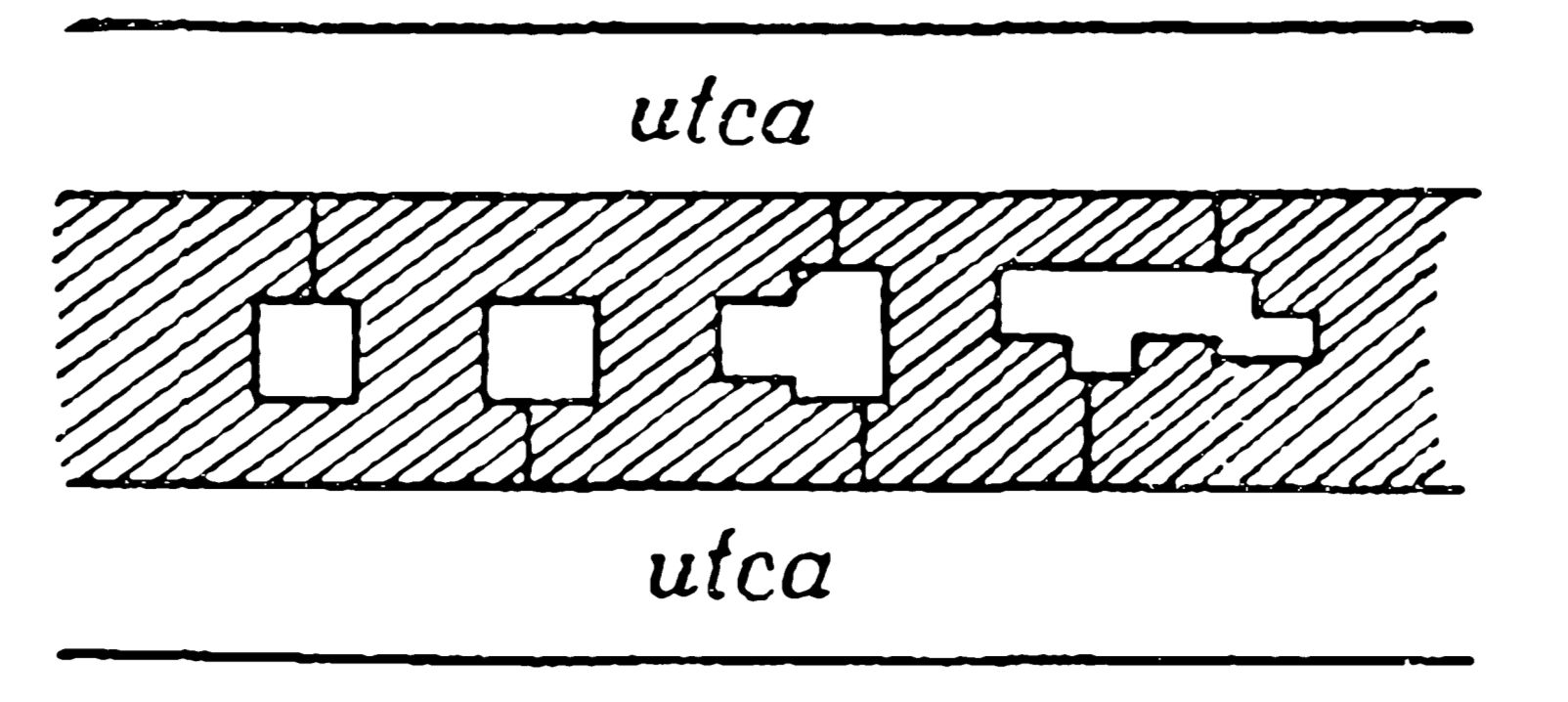 Később más építési módot kezdtek, és most ez vált általánossá. A munkáscottage-okat ugyanis most már szinte sohasem egyenként, hanem mindig tucatjával, sőt százával építik, — egy vállalkozó mindjárt egy egész utcát vagy több utcát is épít. Ezek elrendezése a következő: az egyik sor — lásd az alábbi rajzot — elsőrangú cottage-okból áll, amelyek oly szerencsések, hogy hátsó ajtajuk és kis udvaruk van; ezek bére a legnagyobb. A cottage-ok udvarai mögött húzódik egy keskeny utca, a hátsó utca (back street), amely mindkét végén be van építve, és oldalról vagy keskeny út, vagy fedett folyosó visz hozzá. Azok a cottage-ok, amelyek erre az utcára nyílnak, a legolcsóbbak, és általában nagyon elhanyagoltak. Hátsó faluk közös a harmadik cottage-sorral, mely az ellenkező oldalon utcára nyílik; a harmadik sor bére olcsóbb, mint az első soré, de drágább, mint a második soré. Az utcák elrendezése tehát körülbelül ilyen: